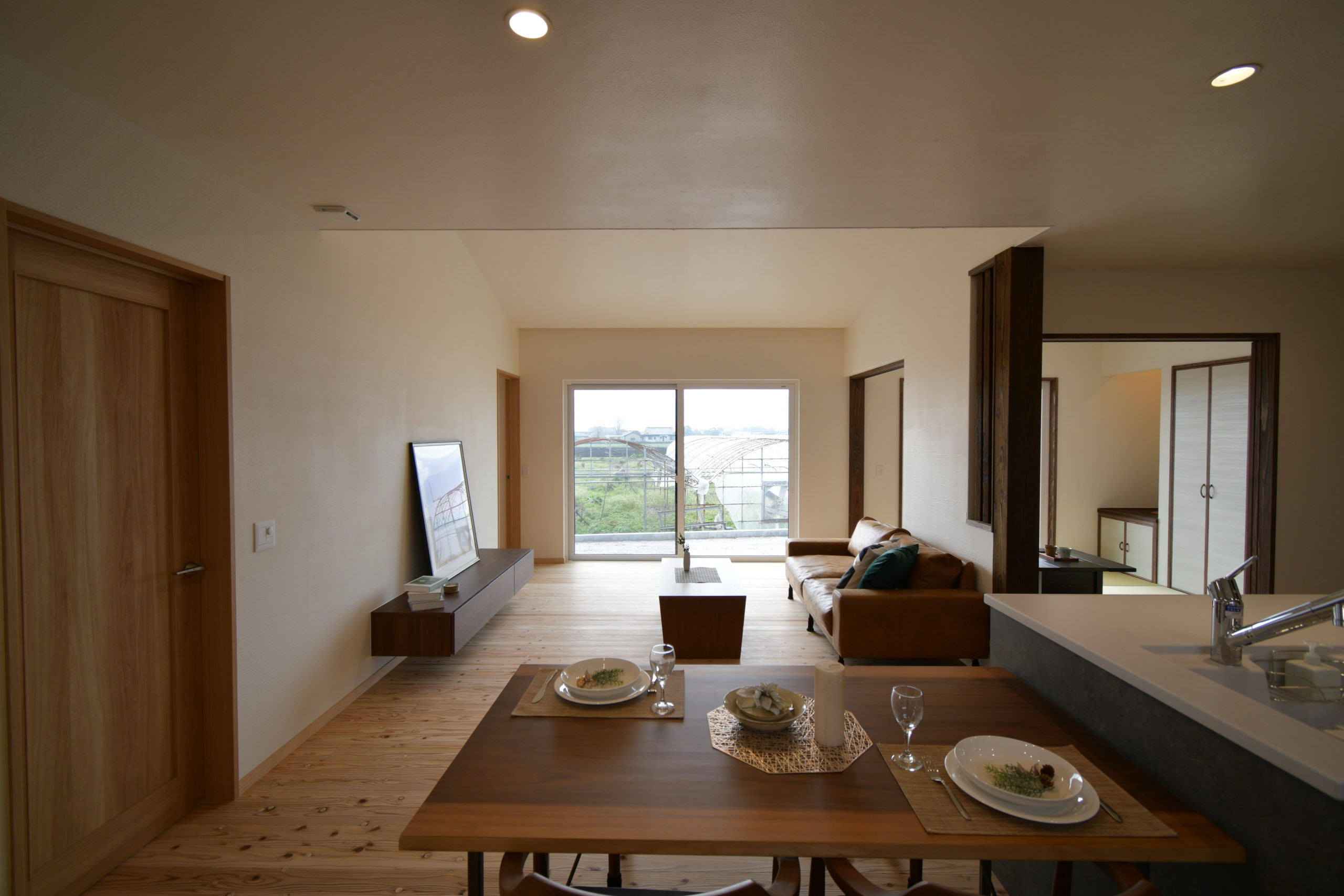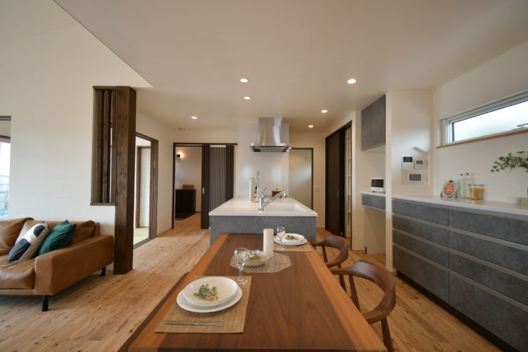 時代を問わず、人気の平屋。室内は、丸和建設こだわりの杉の無垢の床材と空気を綺麗にする漆喰をふんだんに使用した、木の香りが落ち着く空間に仕上げています。また、暮らしやすさを叶えるための動線設計にもこだわりを持っています。