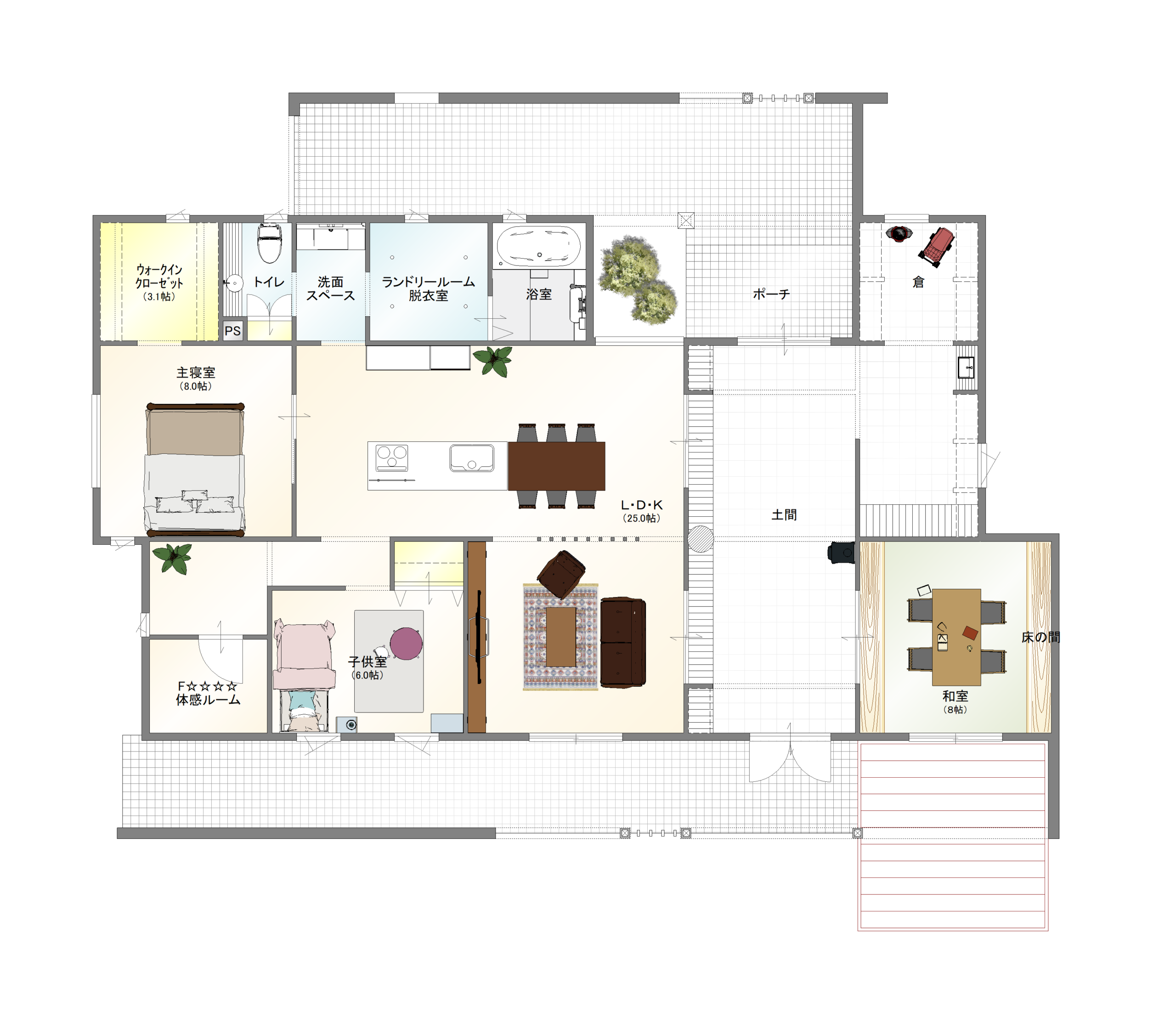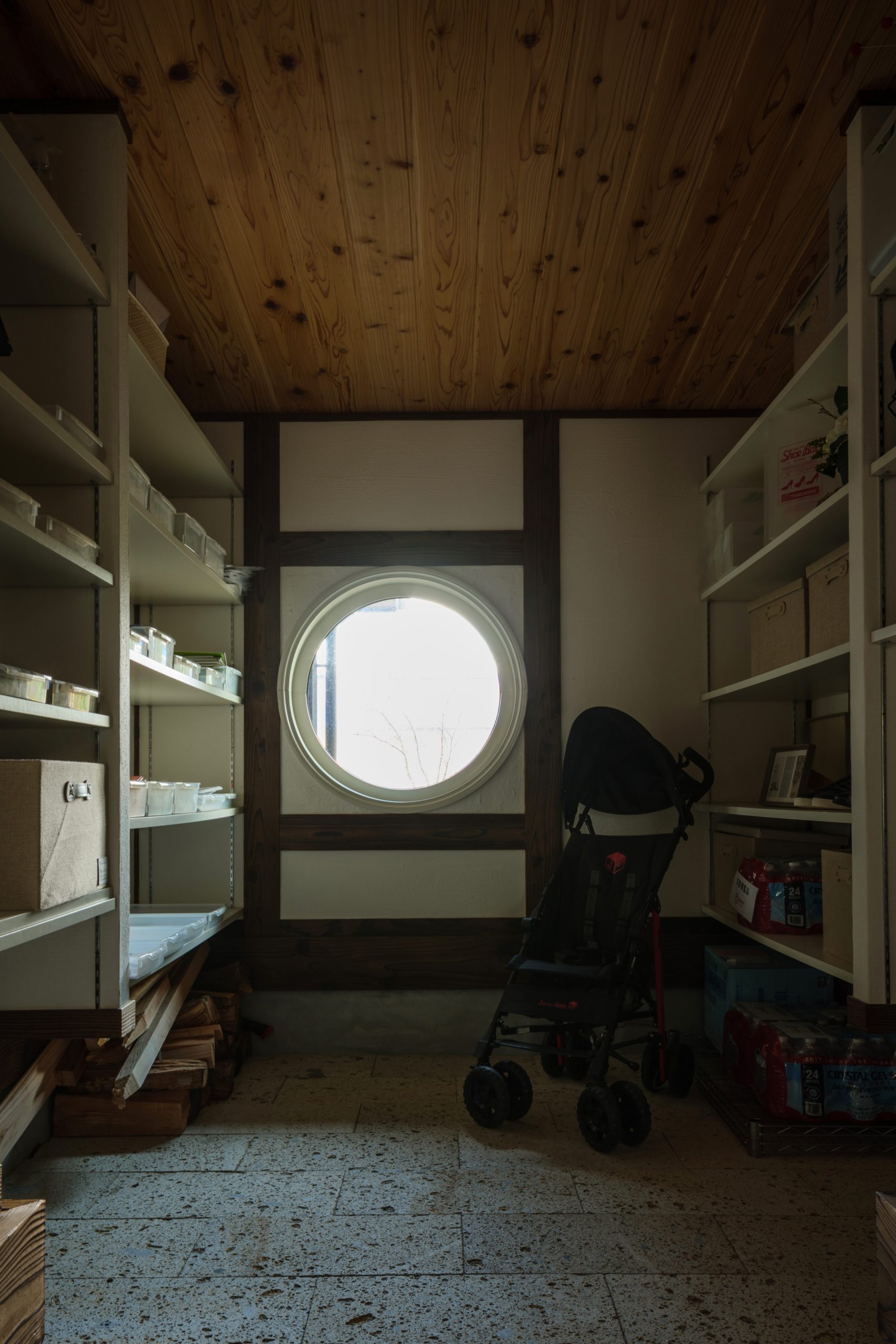 玄関から和室へと繋がる空間は、日本の住まいの象徴的な大空間である「土間」に。その一角には、ベビーカーやアウトドア用品といった大きな物もたっぷり収納できる広々とした玄関収納を設けることで、家の中をすっきりとする工夫を施しています。