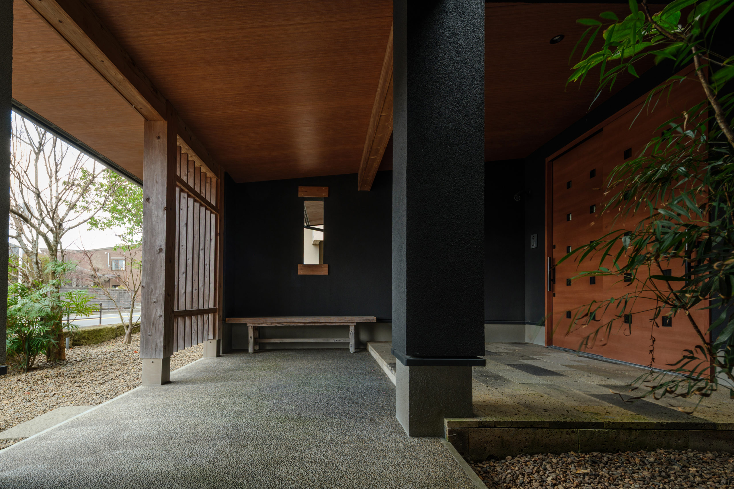 ソトの庭に面した、大きな「土庇」がある軒下空間。光と影、風と香り、雨音、静寂など、自然の情緒を感じる「場」です。外に閉じた、住まい手のプライベート空間として。また、温もり溢れる光が注ぐ、開かれた空間として。味わい方は様々です。