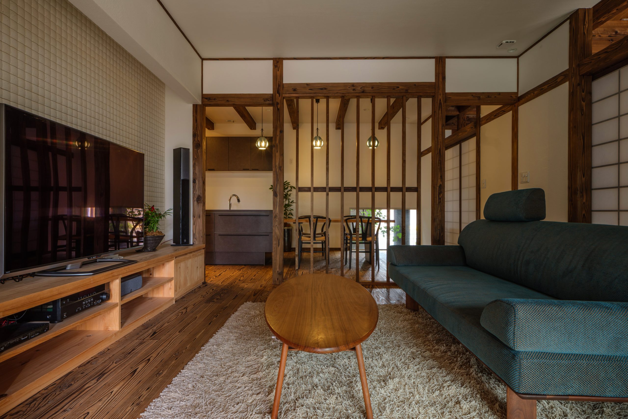LDK空間は、ひと繋がりにせずメリハリをつけながらも、リビングとキッチンの間を天然木の格子にすることで、家族間のコミュニケーションを叶える空間に。南九州産の杉材『音響熟成®木材』や造作家具など、こだわりの良質素材を各所に活用しています。
