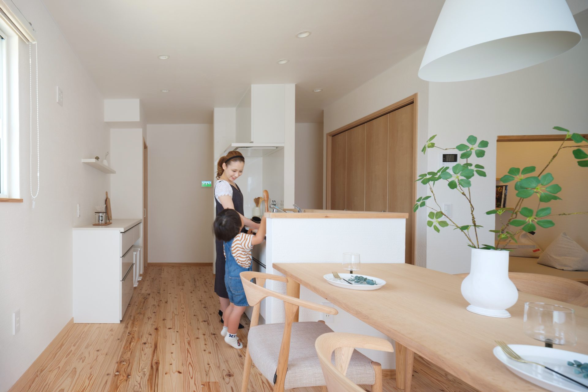 室内は、白の漆喰と明るめの天然木で統一することで、自然素材の心地よさを五感で感じる空間に仕上げました。