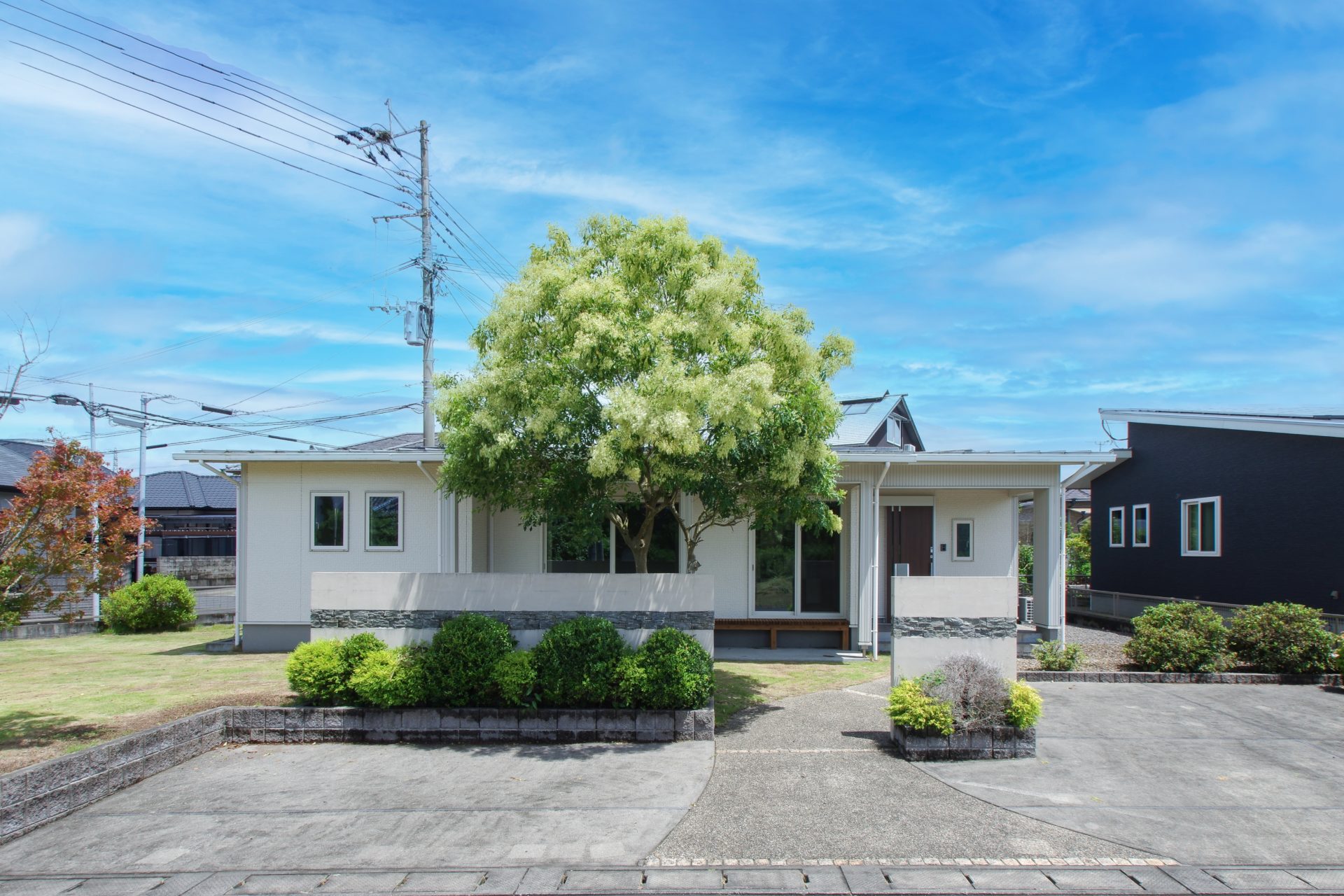 芝生の緑に真っ白な外観が際立つ、普遍的な外観デザインの平屋。広いタイルデッキスペースでは、庭に施した植栽の四季の移ろいを感じる、自然豊かな住まい。
