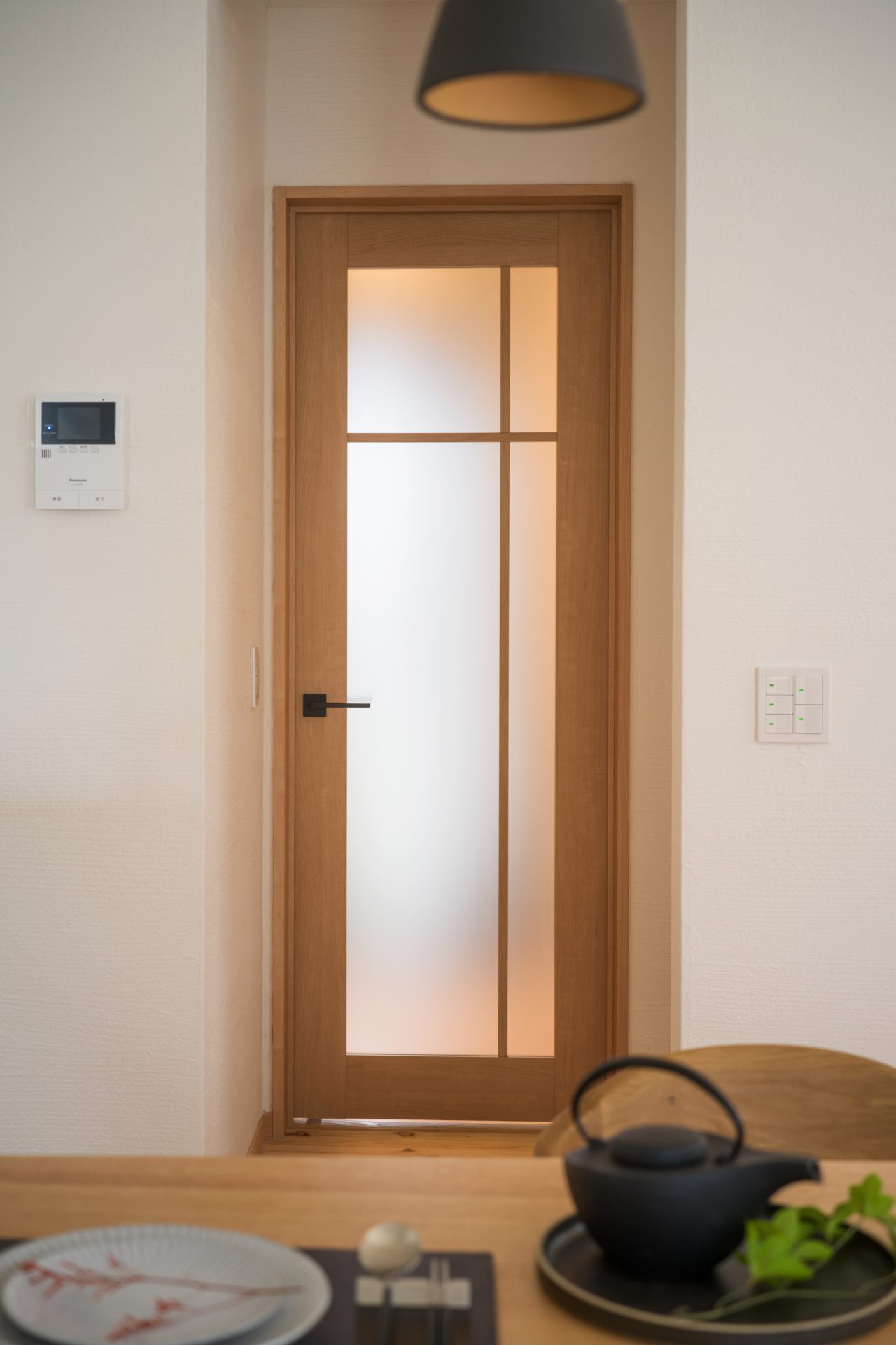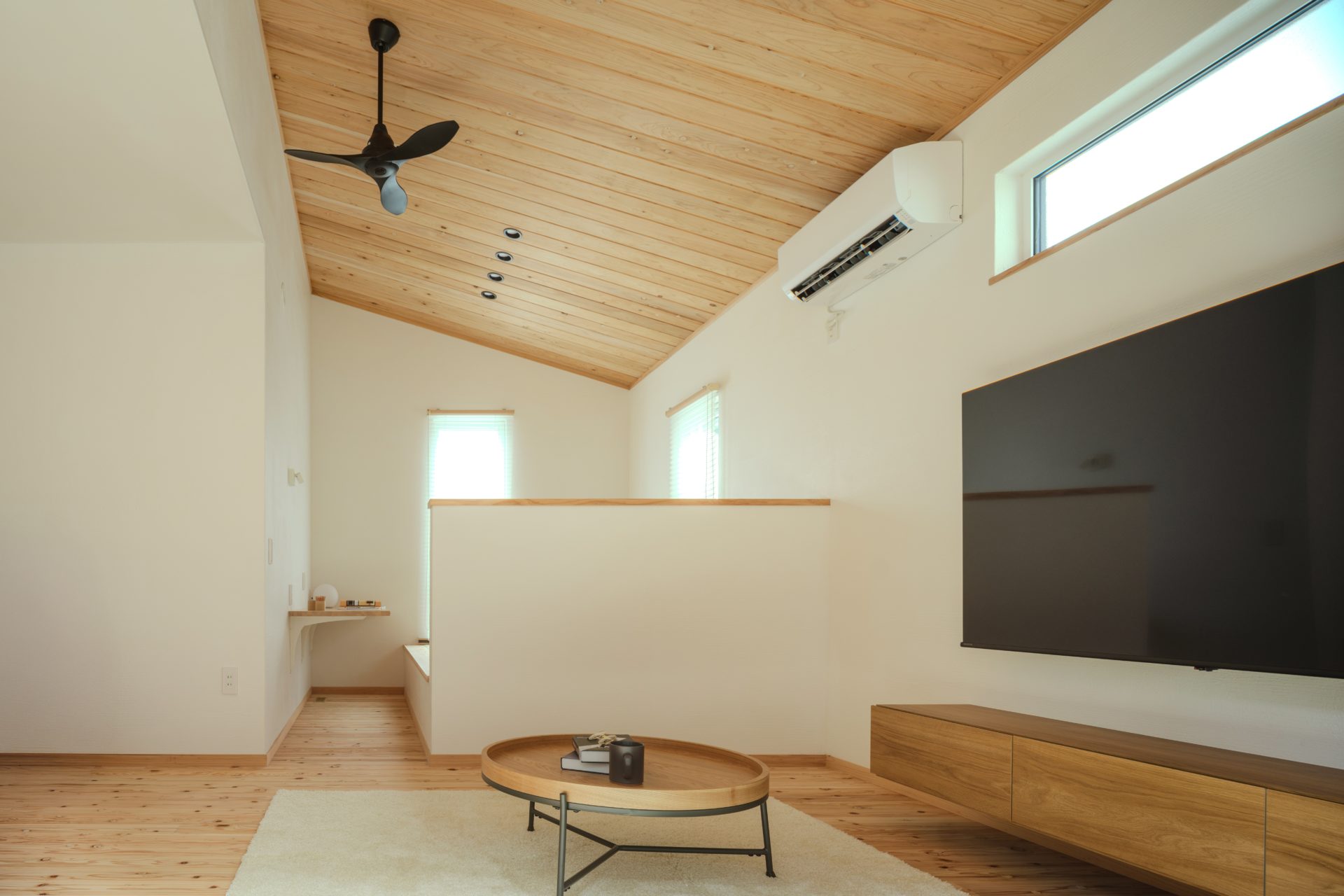 室内の壁は余計な装飾を設けずに、白の漆喰で統一すると共に、床と勾配天井に明るめの天然木を使用することで、室内全体を明るく、開放的な空間にしました。